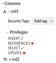 - Columns: Access and manage columns. You can see and modify column permissions of selected identity.