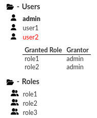 Example for PostgreSQL: The available options are Users (identities that can log in) and Roles (identities that cannot log in). A selected identity will be highlighted in red. The superusers (users with superuser permission granted, which gives the ability to do almost everything on the database) are bolded.