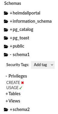 Warning in PostgreSQL: Our API shows aggregated privileges with source. Be aware of "hidden" privileges when inheritance occurs due to a lack of the USAGE privilege on the schema level.