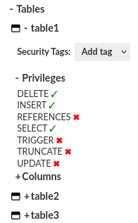 - Tables: Access and manage tables. You can see and modify table permissions of selected identity.
