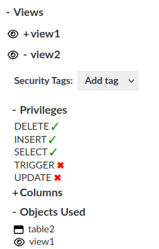 - Views: Access and manage views. You can see which views and tables are used by selected view. You can see and modify view permissions of selected identity.