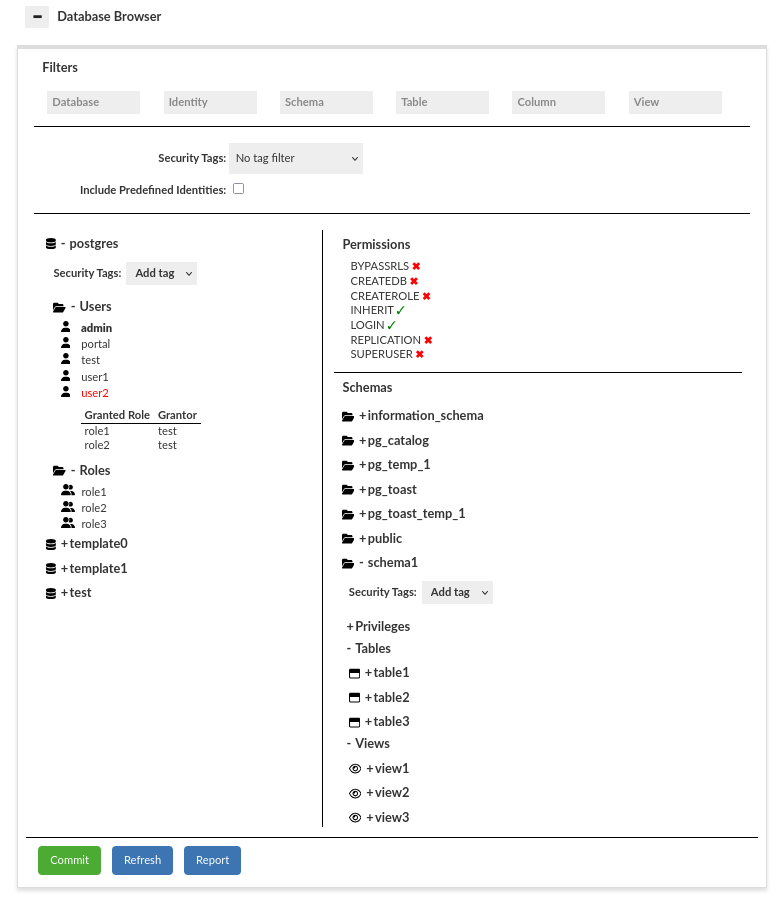 Information: The supported databases are PostgreSQL, Greenplum, Redshift, MySQL, SQLServer, and Oracle. As a heimdall dev team, we are in the process of developing aggregated permissions in reports, and revoking aggregated permissions in the database browser. Showing and revoking aggregated permissions in the database browser is working only in PostgreSQL, Greenplum and Oracle at this moment. Showing aggregated permissions in the report is working only in PostgreSQL, Greenplum and Oracle as well.
