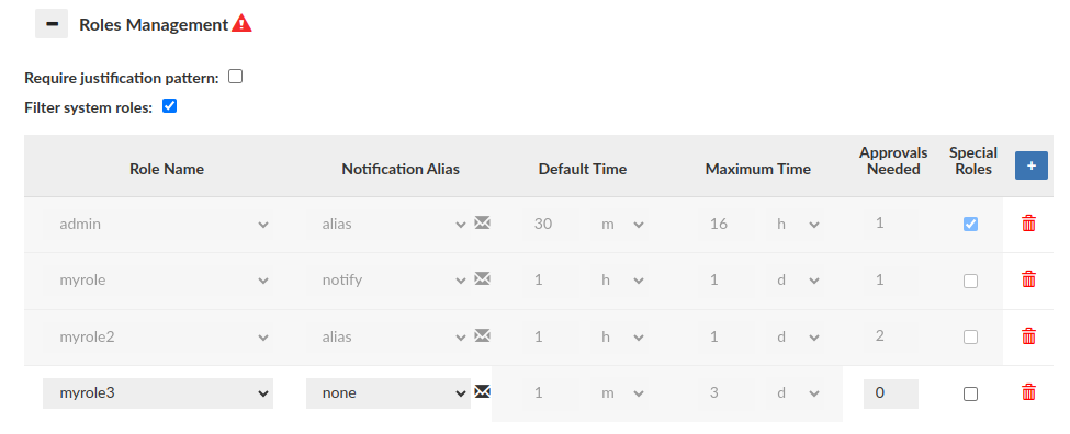 Next part of this section is used to manage roles in the database. In the configuration for a single entry with a role, you can specify a notification alias associated with an email group. This group will be informed when, for example, a session is requested for a particular role. Additionally, there are other options like the one to set the number of approvals needed to approve a specific role.