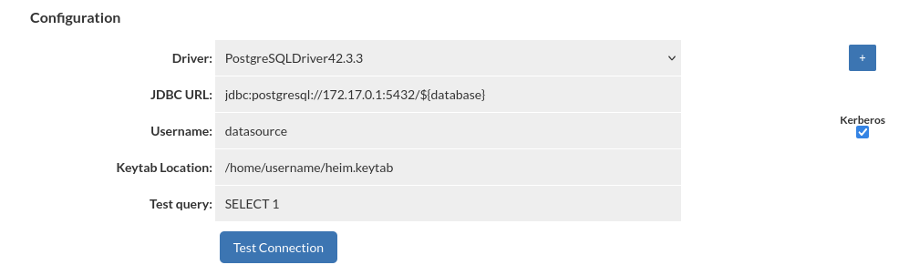 To enable Kerberos authentication for your database connection, check the 'Kerberos' box and provide the username along with the keytab location. If keytab location is empty, the default location is /etc/krb5.keytab.
