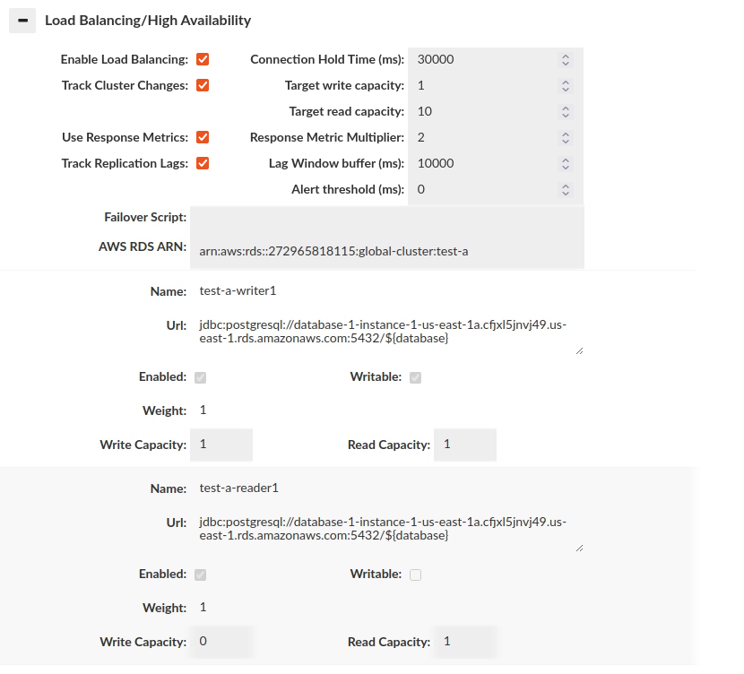 The JDBC URL configuration will normally be build through the configuration wizard, or can be copied from an existing JDBC application. Properties on the JDBC URL can be moved to the name-value list in the connection properties, OR can remain in the JDBC URL–either works, although using the name-value list provides an easier to view list vs. a long URL. When internally doing database type detection, the JDBC url is also used to determine what type of database is in place, for per-database behavior adjustments. When using load balancing, this URL is not in general used, with one major exception--when using the hdUsePgNotify option, this will be the target used for notifications. This is necessary as Postgres notifications will not be shared between nodes, and as such this should point to a single name that resolves to a single target database.