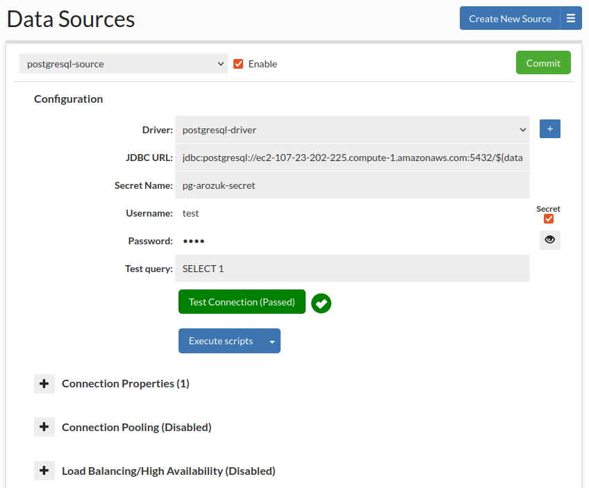 When Secrets Manager is configured (Admin -> Secrets Manager Configuration tab), users will encounter an enhanced configuration option: the Secrets Manager checkbox located adjacent to the username field. Enabling this option reveals an additional field for the Secret Name. Upon inputting the Secret Name and subsequently clicking the Commit button, the system will automatically retrieve credentials such as the username and password from configured Secrets Manager.