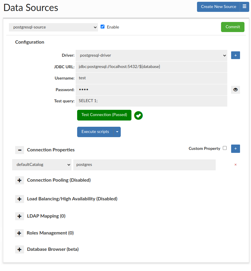 A data source represents access via JDBC to a back-end database server. Each VDB definition must have at least one default data source associated with it, which will be used if no policy dictates what database should receive a query. Source configuration includes the connection properties, connection pooling, and Load balancing and cluster management characteristics.