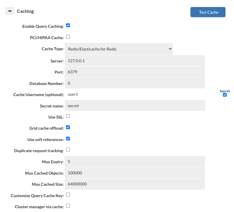 Test cache: The "Test Cache" button allows the user to verify whether a cache connection can be established. Additionally, it checks if key tracking is enabled. If key tracking is not enabled, an alert message will be sent to inform the user about it. After reloading the configuration, make sure to wait for a minimum of 10 seconds as the cache will need to restart. Failing to wait can lead to incorrect test results.