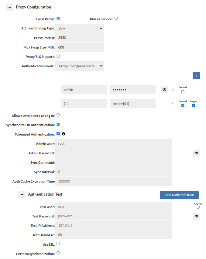 - Authentication Test: This section allows testing of authentication at the proxy layer. As full SQL based authentication can provide options such as limiting the scope by source IP, what database (these are taken by default from Data Source JDBC URL), or even if you are connecting via SSL or not, this gives a convient UI to determine if an authentication request would pass or fail the proxy layer. Please note--this still requires authentication at the database level, which is not tested via this interface.