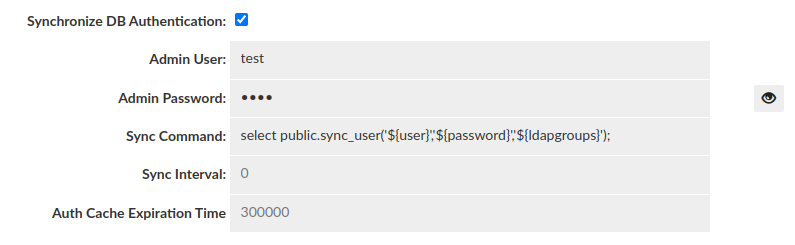 Synchronize DB Authentication: Specifies if synchronization of users and groups should be performed. Moreover, it allows configuring how often the synchronization is allowed to perform after reconnection (Sync Interval) and how long that data will stay in Authentication Cache (Auth Cache Expiration Time).