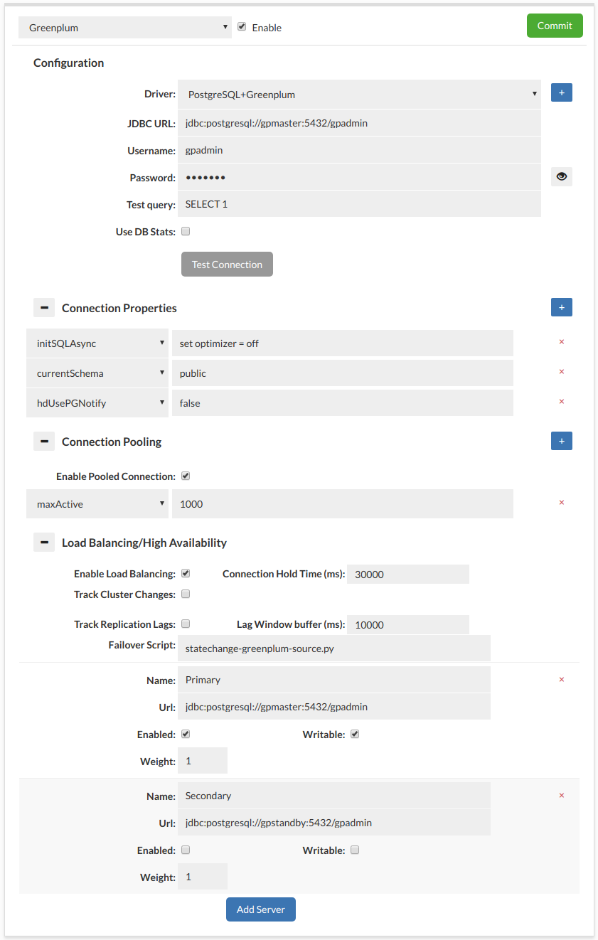 Below is a screenshot of the default recommended data source configuration for a baseline Greenplum cluster. Details are explained below: