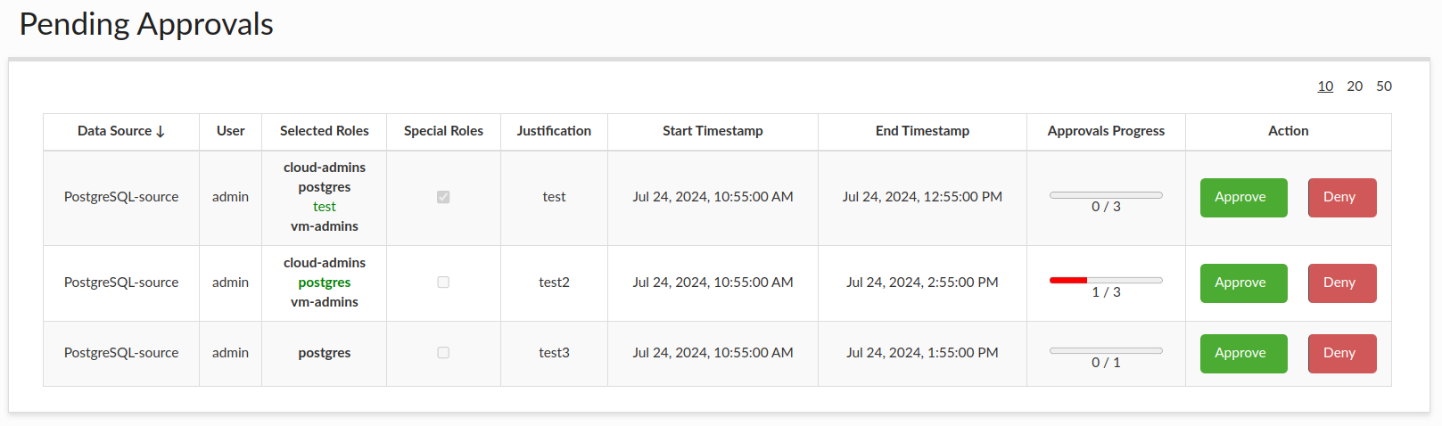 The Pending Approvals tab displays all requested sessions that have not yet received approval or denial and have a status of "CREATED". Only sessions that a particular user (approver) can approve or reject are shown. The relevant columns provide information such as the session request date, data source, user, requested roles, justification, whether the inheritance of special roles is requested, approvals' progress bar and the session duration. The roles that will be approved by clicking the "Approve" button are in bold, while roles that have already been approved are in green.