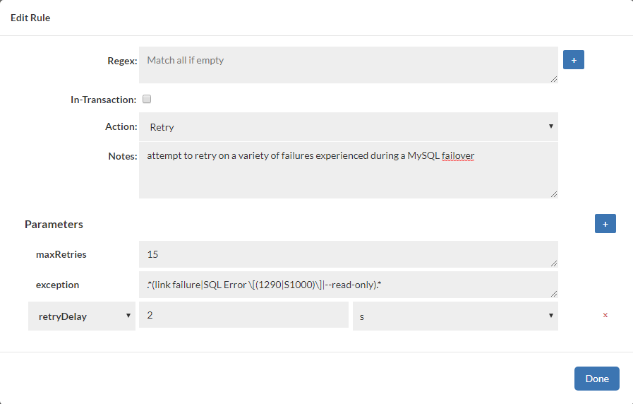 Heimdall supports capturing and retrying queries based on the exceptions returned by the underlying JDBC driver. This allows a variety of conditions that would otherwise break an application's processing flow, and allow retry logic to kick in, potentially resolving the issue. This is most useful for transient errors, such as during a failover, a deadlock situation, etc. For example, in order to support a graceful failover of a MySQL cluster (including Aurora), the following rule can be used: